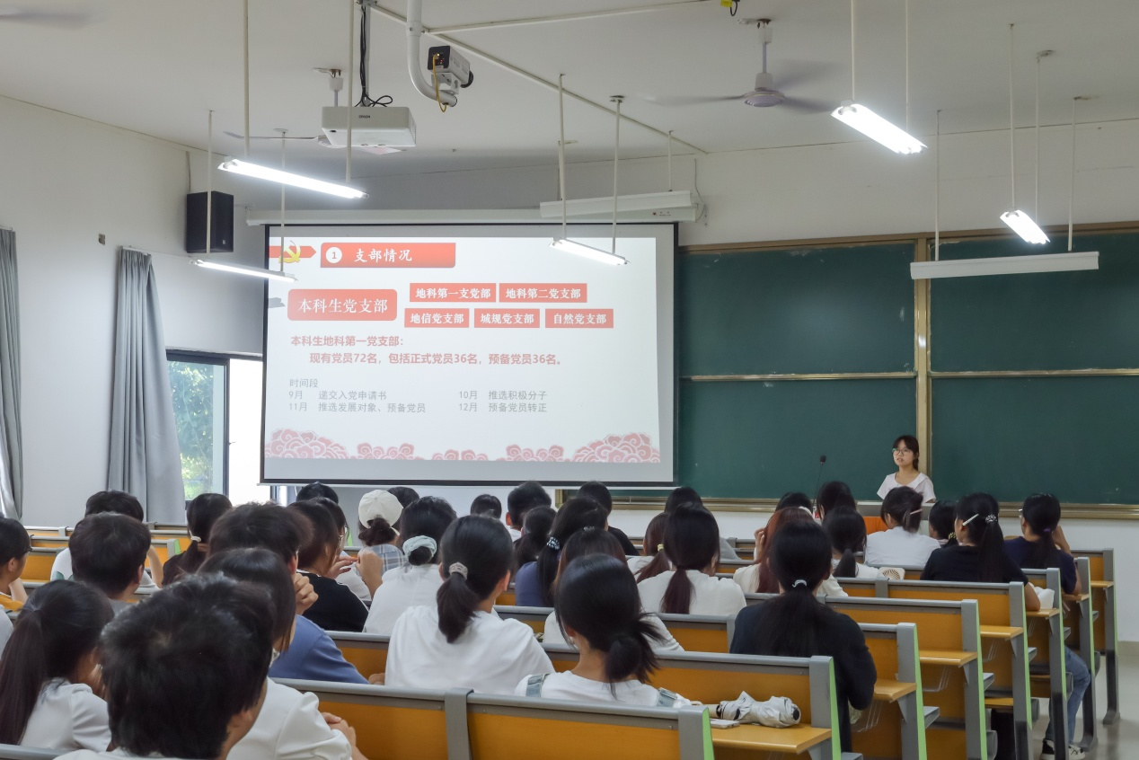 会议伊始,罗慧敏同志系统阐述了党的性质、宗旨、指导思想和奋斗目标。接着,她对公司党支部情况进行了简单介绍,强调了入党的几个大时间段,并对本科生地科第一党支部的风采照片进行展示。随后,罗慧敏同志从“申请入党”“入党积极分子的确定和培养教育”“发展对象的确定和考察”“预备党员的接收”“预备党员的教育、考察和转正”这五个阶段进行了讲解,其中特别强调了入党申请书的规范写法、思想汇报的重要性以及政治审查的严肃性,为有志入党的同学提供了清晰、明确的行动指南。最后,梁浩源老师对会议进行总结,他指出全体新生要以此次启蒙教育为新的起点,认真思考人生方向,将爱国之情、强国之志、报国之行自觉融入日常学习和生活中,积极学习党的理论知识,主动向党组织进行思想汇报,以党员的标准严格要求自己,争取早日成为一名合格的共产党员。
