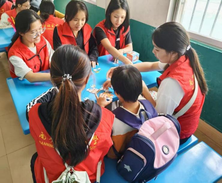 活动伊始,志愿者与小朋友开展球类友谊赛,通过篮球、排球等球类活动锻炼小朋友的身体协调性和反应能力,帮助他们在传球互动中建立团队意识、逐步减少社交隔阂。随后,志愿者同小朋友进行拼图游戏,将一个个拼图碎片拼接成完整的图片,引导他们在探索中发现碎片之间的关联,并在拼图过程中获得成就感。紧接着,志愿者为小朋友准备了白纸与彩色画笔,陪同他们进行绘画活动,让他们在一笔一画中尽情发挥想象力与创造力,自由表达内心世界。此外,志愿者还为小朋友提供绳子和形色各异的珠子,引导他们进行串珠子游戏,并耐心地陪同他们挑选和搭配珠子,串联成手链。最后,志愿者组织小朋友开展童趣互动赛,通过老鹰捉小鸡、踢毽子等趣味游戏与他们进行互动,在热闹的氛围中增强活动参与感与集体归属感。活动结束后,志愿者们合影留念。