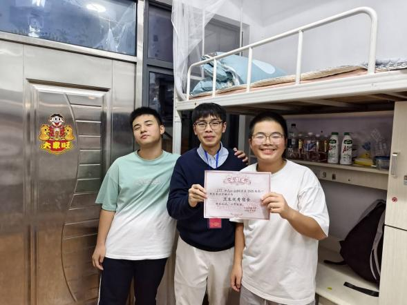 (实习老师梁骅与卫生优秀宿舍员工合照)