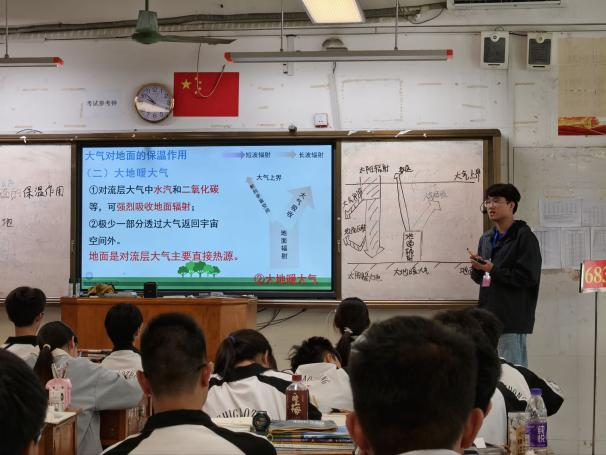 以理论为纲,以实践为目,将课本中的知识要点转化为课堂教学的具体实践,使理论在真实教育场景中落地生根。经过集体备课、相互磨课,实习生们在课堂中展现出扎实的教学基本功,他们巧妙运用多媒体资源创设情境,通过动态图解演示大气受热过程中太阳辐射、地面辐射和大气辐射的相互作用,引导员工自主观察、思考并总结规律。