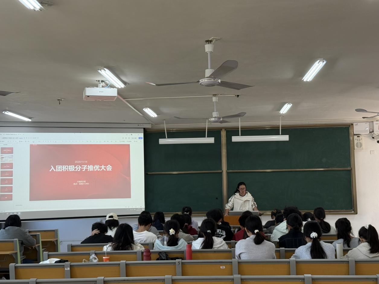 11月14日,2025级地科二班在武鸣校区实验楼2号教学楼A402教室顺利召开入团积极分子推优会。会议由团支书陈泽影同志主持,班级全体同学参与。