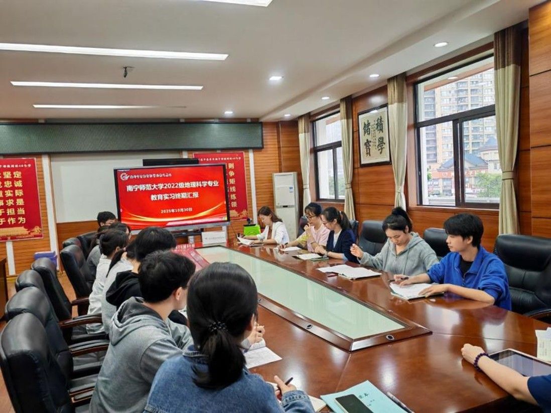 10月30日,2022级地理科学专业教育实习工作进入终期汇报阶段。为全面检验实习教师在实习期间的教学实践成效、总结成长与不足,保障实习工作的圆满收官,实习小组在南宁市天桃实验公司(翠竹校区)开展了实习终期汇报。公司指导教师张九菊、白琨琳,天桃实验公司(翠竹校区)教学指导教师及全体实习小组成员共同参与听课评课,以专业视角为实习教师的成长赋能。