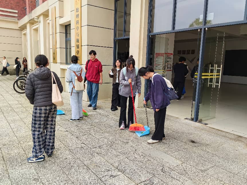 12月11日下午,2024级地科五班全体同学在武鸣校区地海楼、图书馆与中庭北面草坪周边开展了劳动教育实践的清扫活动。