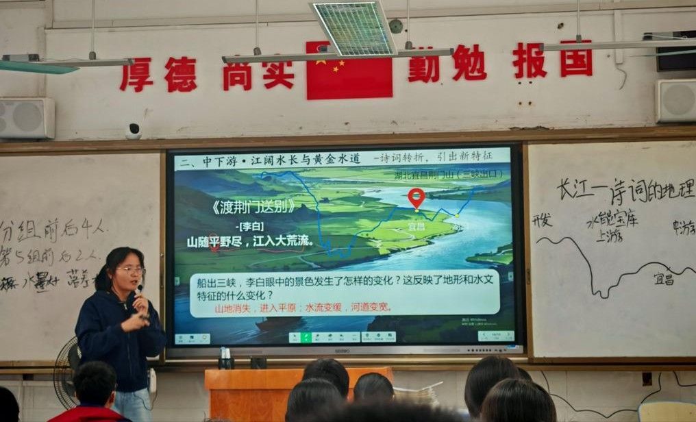 实习教师谢学丹的课堂则独具匠心,以诗词为引、以情境为桥,生动勾勒出长江上中下游的不同地理特点,让员工在诗意氛围中感知地理之美。她在自评中特别反思了课堂时间把控方面的问题,因课程内容较为丰富,且课堂讨论环节耗时超出预期,最终导致课程未能按时结束,一定程度上影响了教学节奏的完整性。指导老师张九菊则对其课堂亮点给予肯定,尤其表扬了两方面优势:一是讨论环节引导词设计精妙,衔接自然且极具启发性;二是讨论问题难度设置精准适配员工认知水平,有效激发了员工的探究热情。同时,张九菊老师结合本节课出现的不科学用语现象,向全体实习老师着重强调:授课过程中需高度重视科学用语的规范性,严格规避不严谨表述,以保障地理知识传递的精准性与专业性。