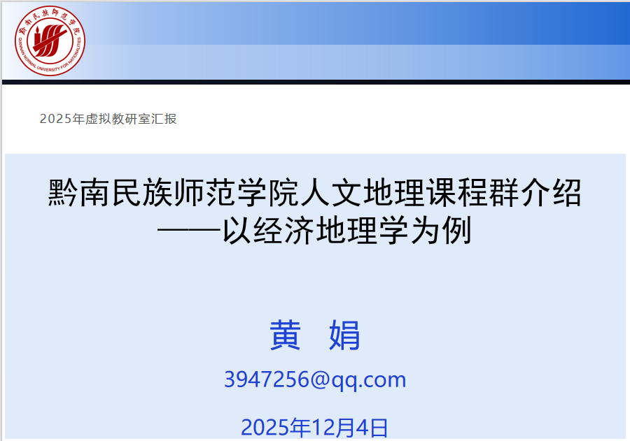 黔南民族师范公司黄娟老师作了题为《黔南民族师范公司人文地理课程群介绍——以经济地理学为例》的报告,系统介绍了该校课程群在课程定位、课程目标、课程内容、课程实施、课程评价、课程特色与展望等方面的建设经验。她重点分享了如何通过“点—线—面”联动的实践教学体系,将课程实践、野外实习与地方产业发展相结合,培养员工的地理实践力与综合思维。黄老师还展示了如何依托三线建设博物馆、少数民族工艺村等地方资源开发乡土课程,有效促进了高等教育与基础教育的衔接。