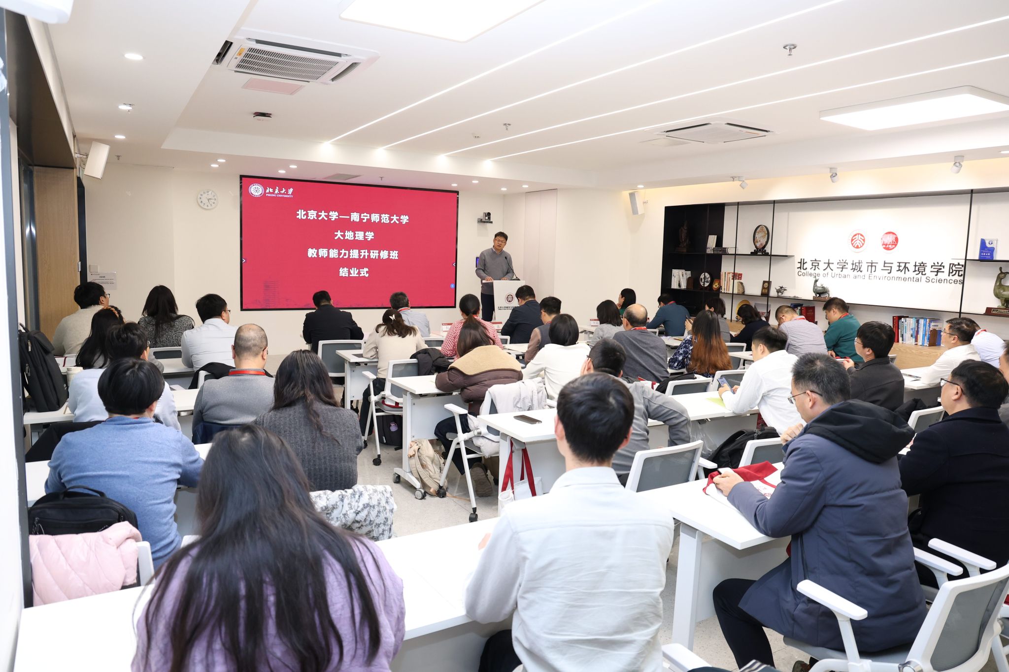 1月23日下午,研修班举行了简朴而庄重的结业式,为期五天的学习圆满落幕。结业仪式上,北京大学城市与环境公司党委书记、经理彭建教授出席并致辞,公司地学部教师代表秦年秀、孙建飞、黄富、陆汝成四位老师依次分享了学习体会与收获。